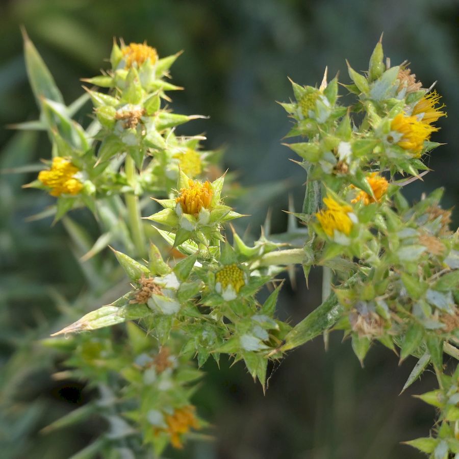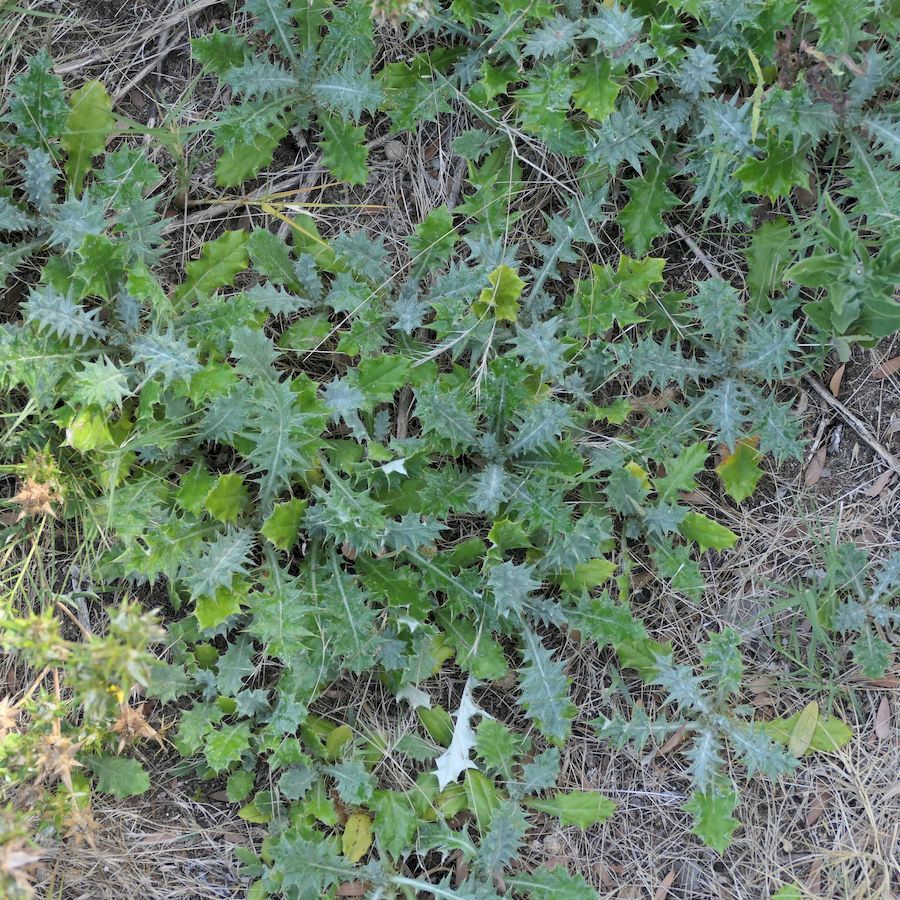 Family: Asteraceae Scientific name: Berkheya rigida Description: Plant Form: Perennial upright rosette herb or sub-shrub. Size: Up to 80 cm tall. Stem: Upright or spreading, woody, spineless. Leaves: Deeply divided up to 10 cm long, with ends of lobes having sharp spines. Bluish-green upper surface mostly hairless, underside woolly. Margins rolled inward towards midrib. Stem leaves smaller than rosette leaves. Flowers: Clusters of yellow disc-shaped flowers in circular flowerhead. Surrounded by spiny, stiff bracts. Typical thistle type flowers. Fruit and Seeds: Cone shaped and blackish 2-3 mm across. Grow in the spent flowers and topped with tiny scales forming a crown-like structure. Habitat: Scrublands, woodlands, roadsides, dunes, coastal scrub, grasslands. Distinguishing Features: Distinguished from Saffron thistle (Carthamus lanatus) by being perennial and having smaller spiny bracts around the flowerheads. Weed Status: Priority Weed Weed Type: Environmental, Agricultural, Common Lifeform: Herbaceous