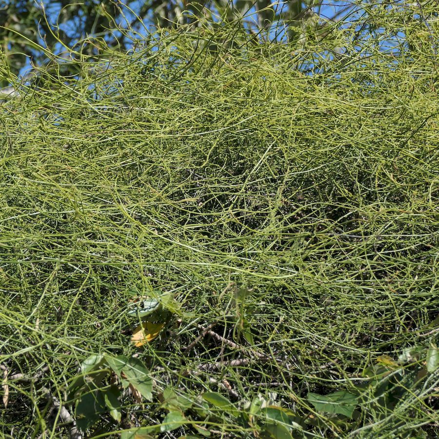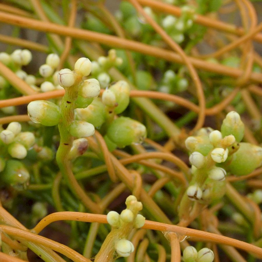Family: Lauraceae Scientific name: Cassytha filiformis Description: Plant Form: Scrambling parasitic perennial vine. Size: 3-8 m wide. Stem: Wiry, many stems forming mats, hairy when young. Produce rootlike structures that penetrate host plant tissue. Leaves: Tiny, scale-like, 0.5-2 mm long. Covered in reddish hairs when young. Flowers: Whitish or greenish, clasping to stems in 2 spiralling rows of 3 which form an inflorescence about 2 cm long. Fruit and Seeds: Green, round, smooth, fleshy and oily, 4-10 mm across. Habitat: This native plant inhabits forests, coastal scrub and rainforests. Distinguishing Features: Distinguished from closely related (and also native) Dodder laurel (Cassytha capillaris) by globular rather than oval-shaped fruit which are green rather than red. May be confused with unrelated Cuscata species which have dry fruit and are annual. Impacts: Note - this is a native plant. Weed Status: Non-weedy native lookalike Weed Type: Lifeform: Vine/climber